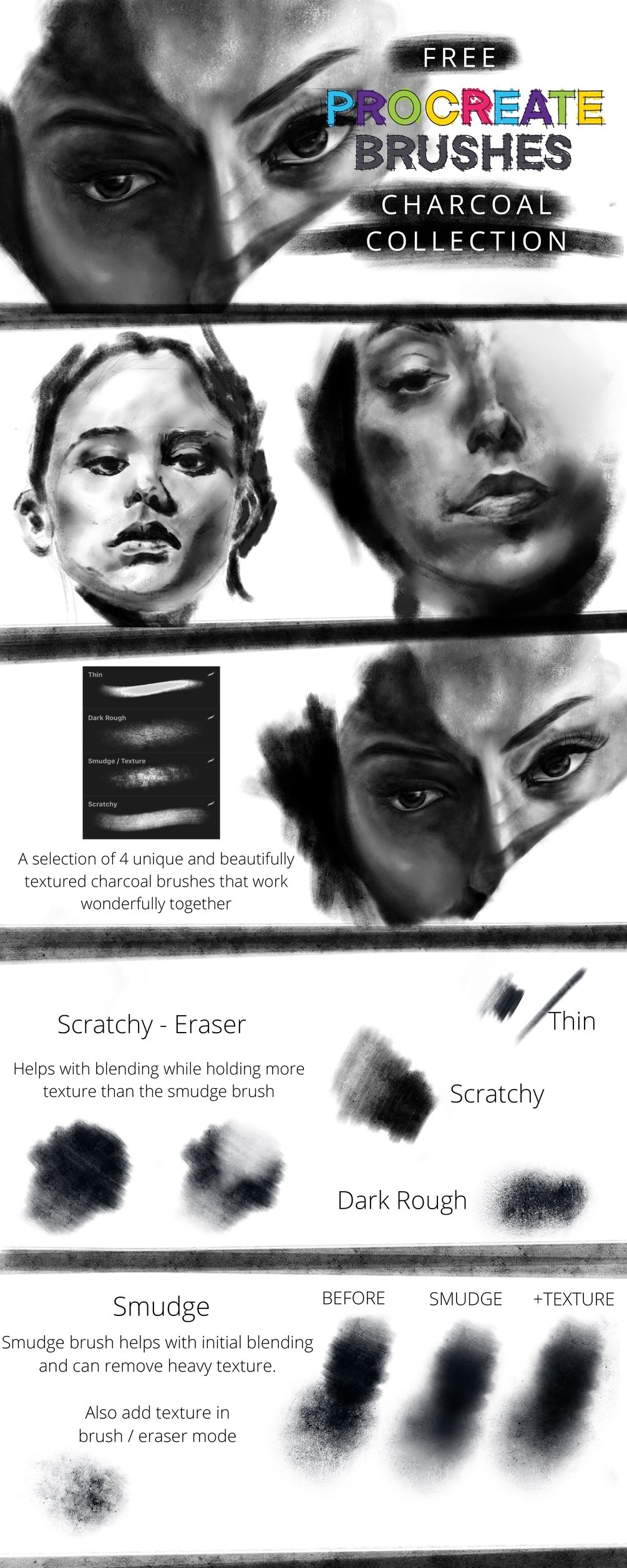 The FREE charcoal collection from CrayonArcade gives you access to 4 charcoal brushes picked from the designed to work and blend together, all artwork shown in the example images have been created with these brushes.